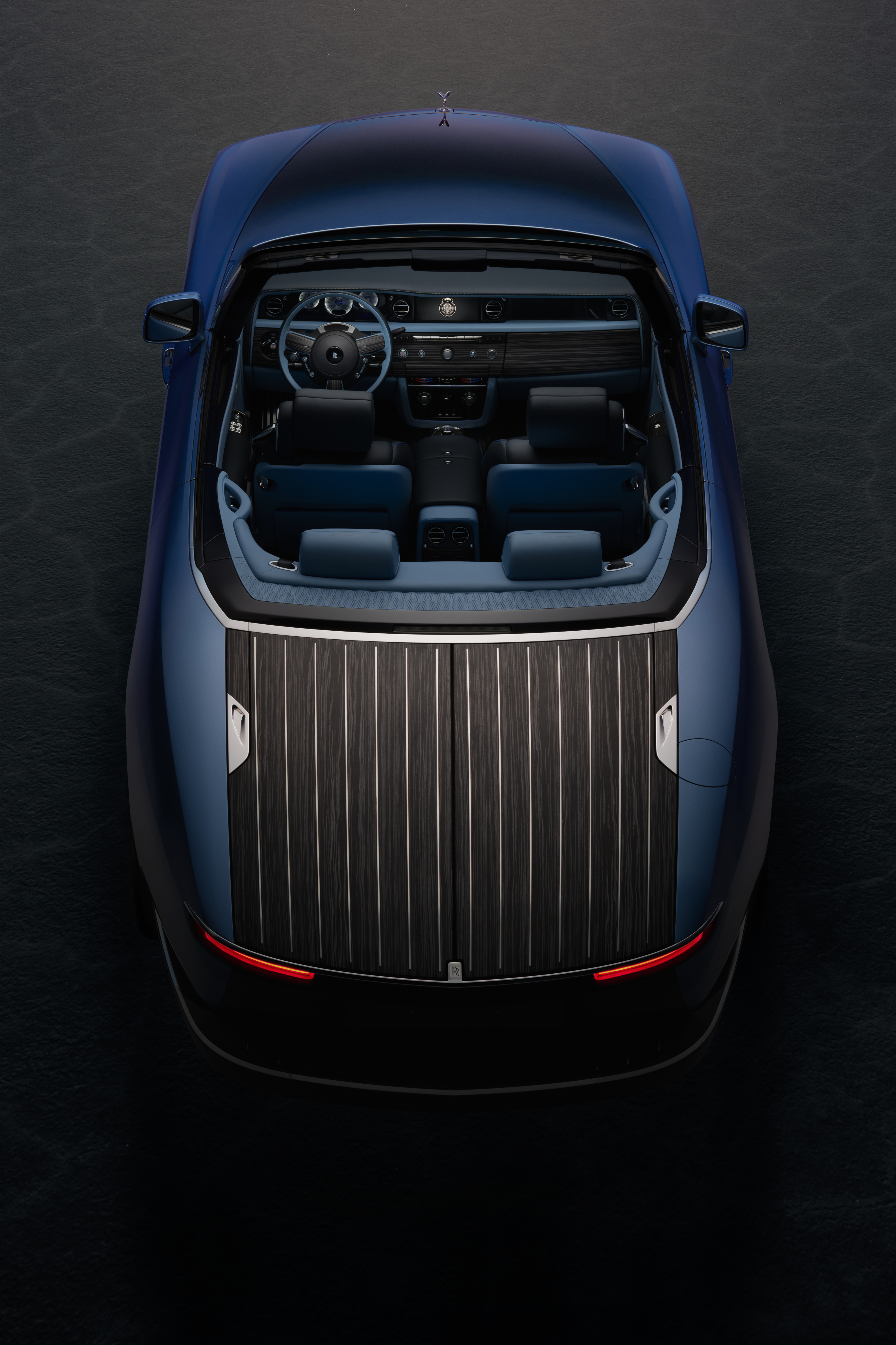 롤스로이스 최초로 그라데이션 도색 과정을 거친 보닛은 상대적으로 깊고 어두운 블루 컬러가 그릴로 향할수록 마치 폭포처럼 밝아진다. 실내 공간의 가죽 또한 그라데이션 처리되었는데 앞좌석 시트는 어두운 파란색, 뒷좌석 시트는 보다 밝은 파란색으로 마감해 운전자 중심인 보트 테일의 특성을 명확히 드러낸다.