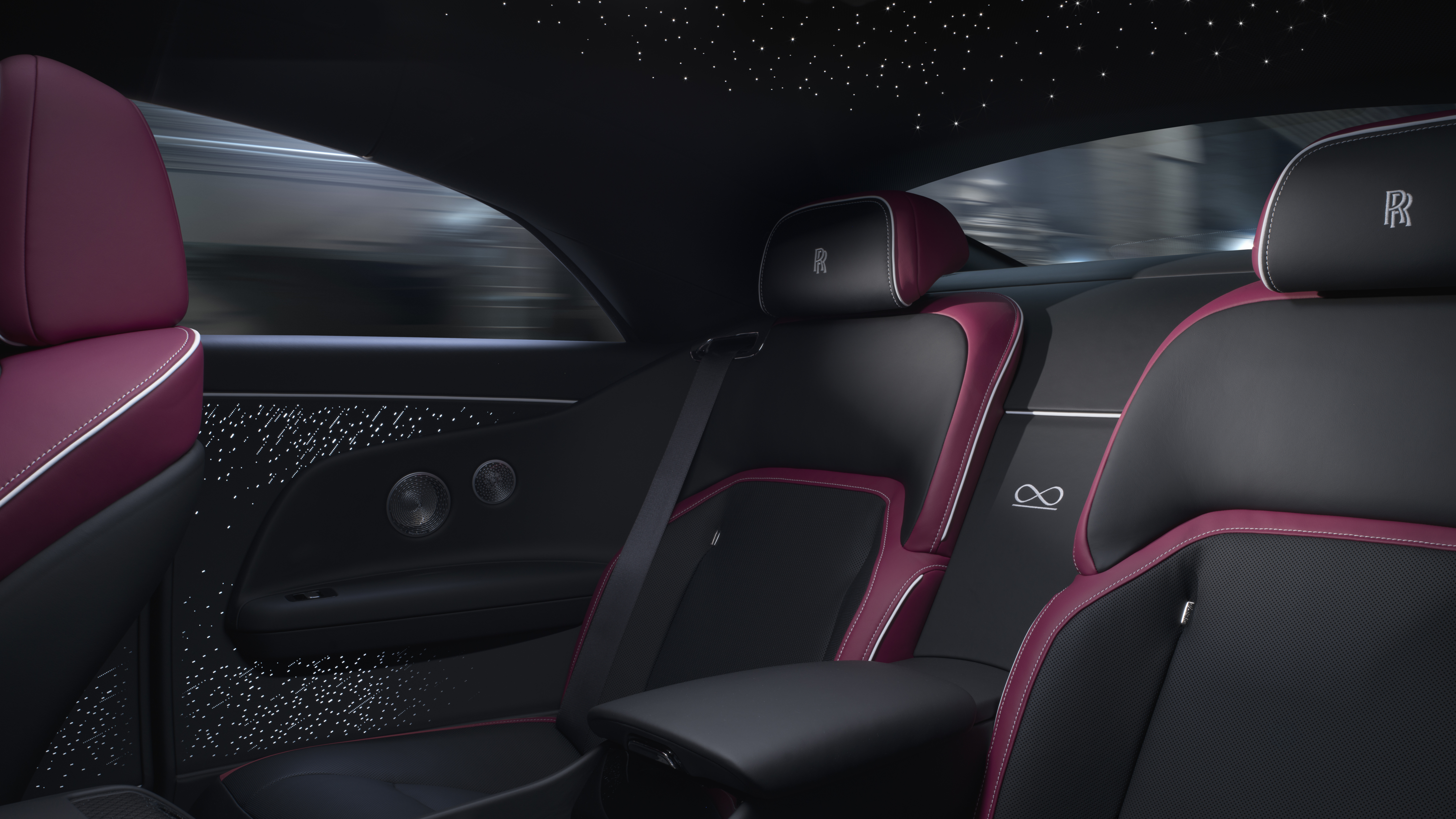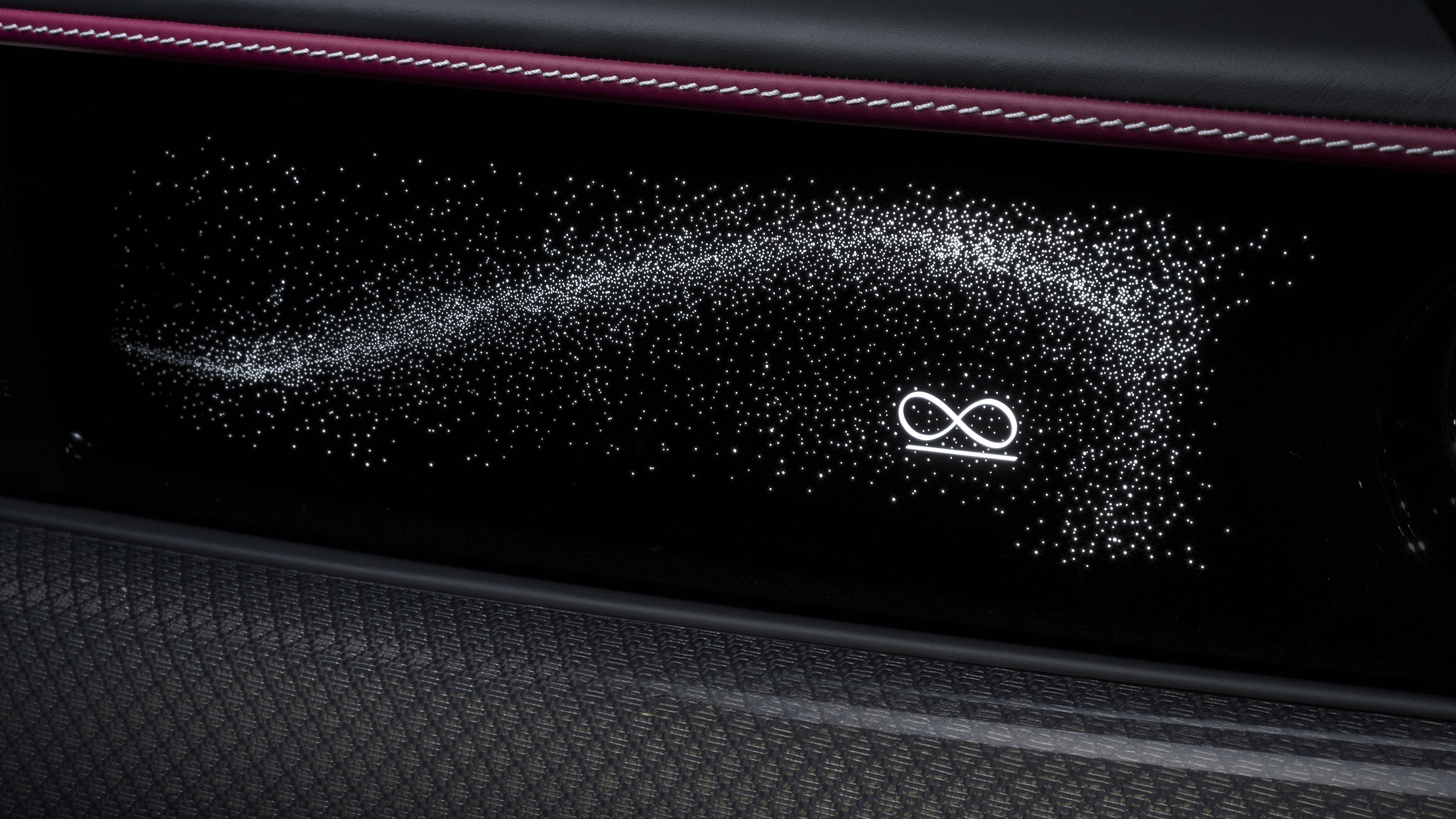 블랙 배지 스펙터에 탑승하면 과감한 인테리어 디자인이 선사하는 강렬한 분위기를 즉시 느낄 수 있다. 환희의 여신상을 추상적으로 표현한 일루미네이티드 페시아에는 블랙 배지의 상징이자 한계를 뛰어넘는 선구자 정신을 의미하는 인피니티 심볼이 더해졌다. 실내 전면부 일루미네이티드 페시아에는 피아노 블랙 색상의 바탕에 5,500개의 ‘별’이 다양한 크기와 밝기로 수놓아져 있다.