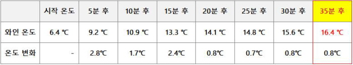 같은 와인을 잘 막아 냉장고에 넣었다가 5시간 후에 꺼냈을 때 와인의 온도는 6.4°C였다. 이후 25°C의 실내에서 5분 단위로 와인의 온도를 쟀는데 35분 만에 원하는 온도(16.4°C)를 얻을 수 있었다.